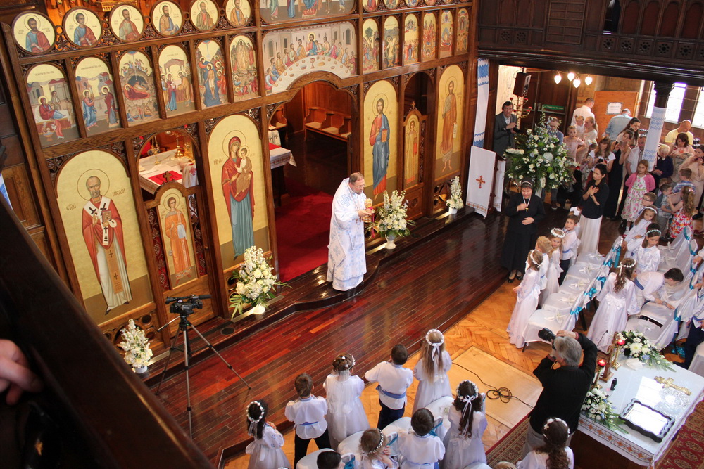 Діти урочисто з запаленими свічками увійшли до храму, де відновили хресні обітниці. Під час Служби Божої причасники молились Символ віри, Отче наш та молитву перед Святим Причастям, виявляючи свою віру і готовність бути справжніми Божими дітьми. Мартин Шахно прекрасно заспівав Апостола. У своїй проповіді Владика Гліб пригадав всім, що ми знаходимося у часі місійної декади і повинні продовжувати бути такими місіонерами як перші апостоли. Після Божественної Літургії діти поділились своєю радістю від пережитих подій у віршах і піснях, дякуючи всім, хто провадив їх до цього свята, а саме: своїм батькам, катехитам і Владиці та священикам, які їх сповідали та уділили святу Тайну Євхаристії. Сестра Бернадета запросила всіх присутніх дбати про свою сім’ю, як про город. Бо все залежить від того, що ми на ньому садимо, те й будемо збирати. Засіюючи в дітях християнські цінності, ми зможемо пізніше насолоджуватись їх плодами.