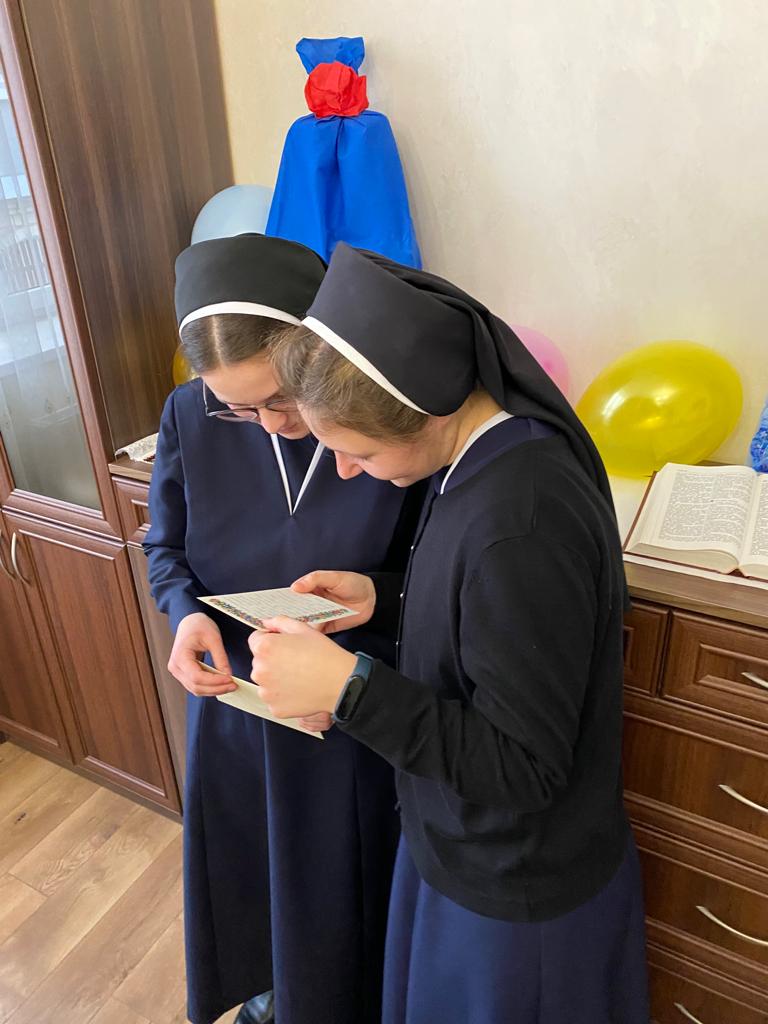 Продовжили святкування спільним обідом. Розділяючи свято з сестрами-новичками, с. Мирослава підкреслила важливість радості у Господі, вірність Йому та витривалість у покликанні. Емоції переповнювали серця молодих сестер. Вони щиро вдячні за уважність та присутність спільноти в їхньому житті.